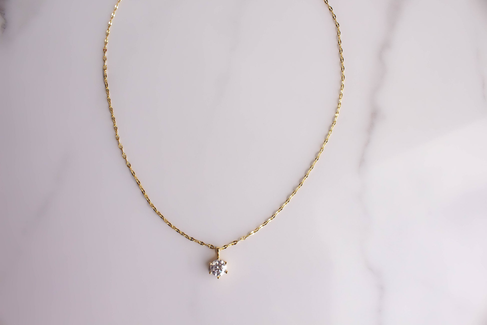 Introducing our stunning solitaire necklace featuring a radiant moissanite stone. With its captivating sparkle and timeless elegance, this necklace is a true statement piece. Perfect for adding a touch of glamour to any ensemble, whether it's a casual day out or a special occasion.