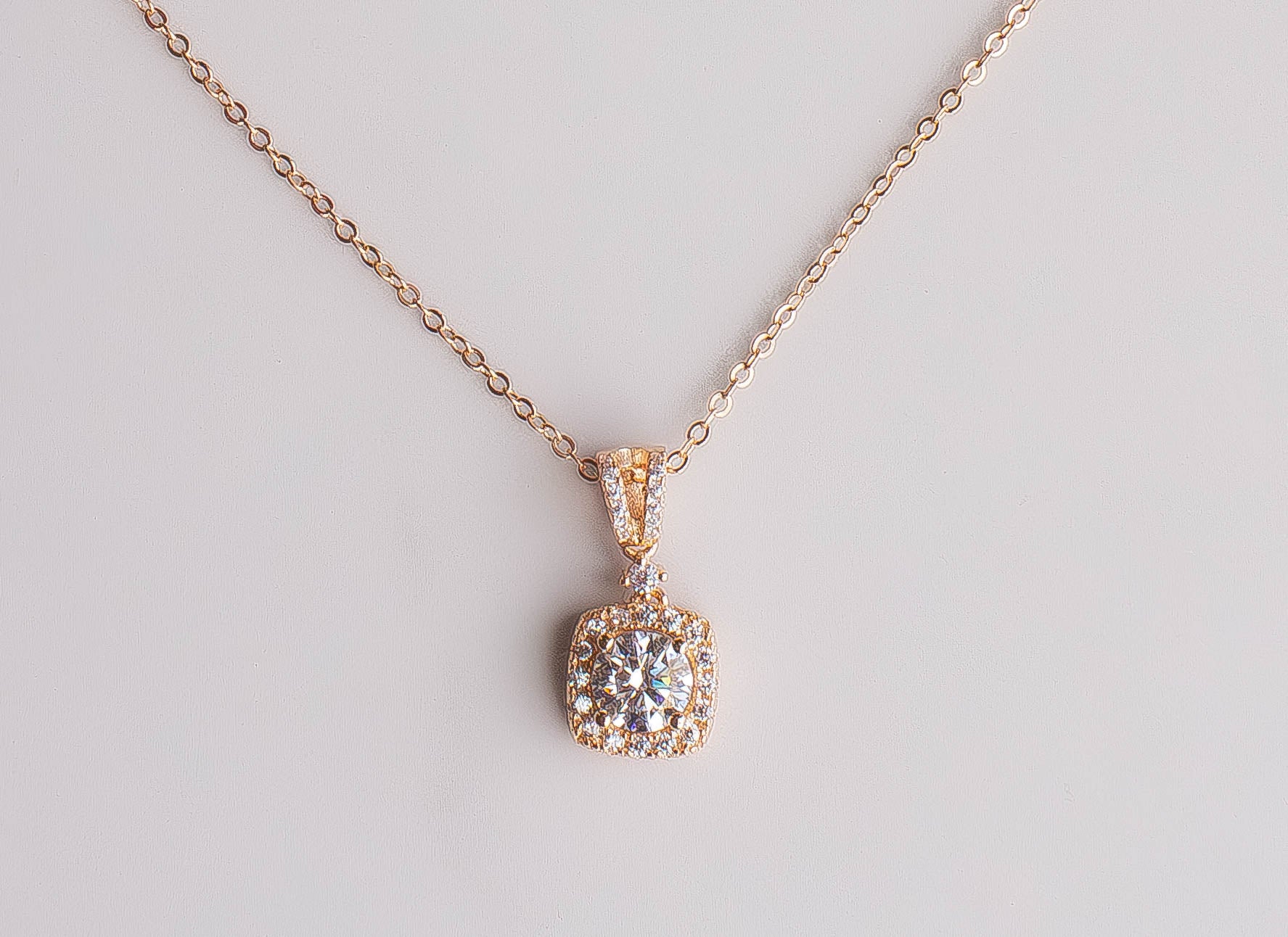 Introducing our exquisite pendant necklace featuring a dazzling moissanite gemstone embraced by a halo of crystals in a square formation. This stunning piece effortlessly captures the essence of modern elegance with its intricate design and brilliant sparkle.